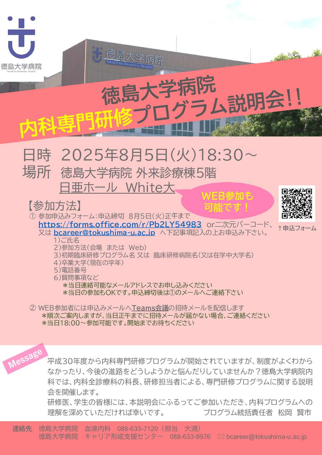 【徳島大学病院】「内科専門研修プログラム説明会」のご案内